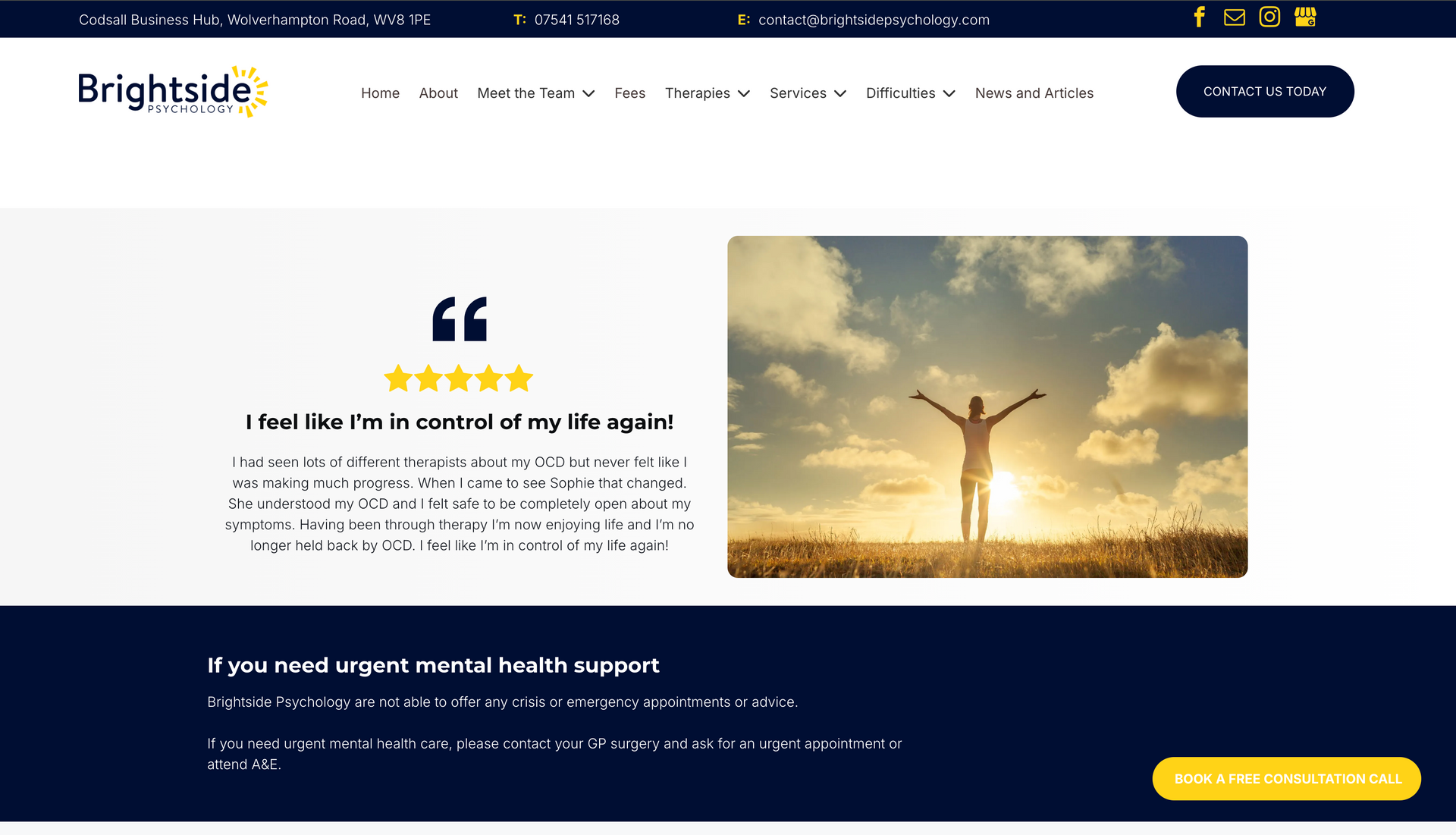 Brightside psychology offers proven therapies for a variety of difficulties including Anxiety, Depression, OCD as well as more general therapies for issues surrounding parenthood and relationships. Given the sensitive nature of the services, it was important to ensure the tone of the website was open and inviting as well as professional. Due to the medical background, all certificates and accreditations were visible to users.