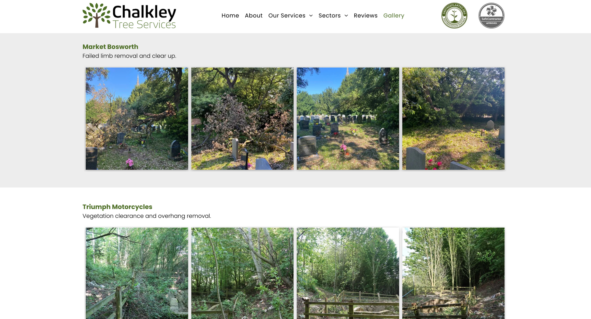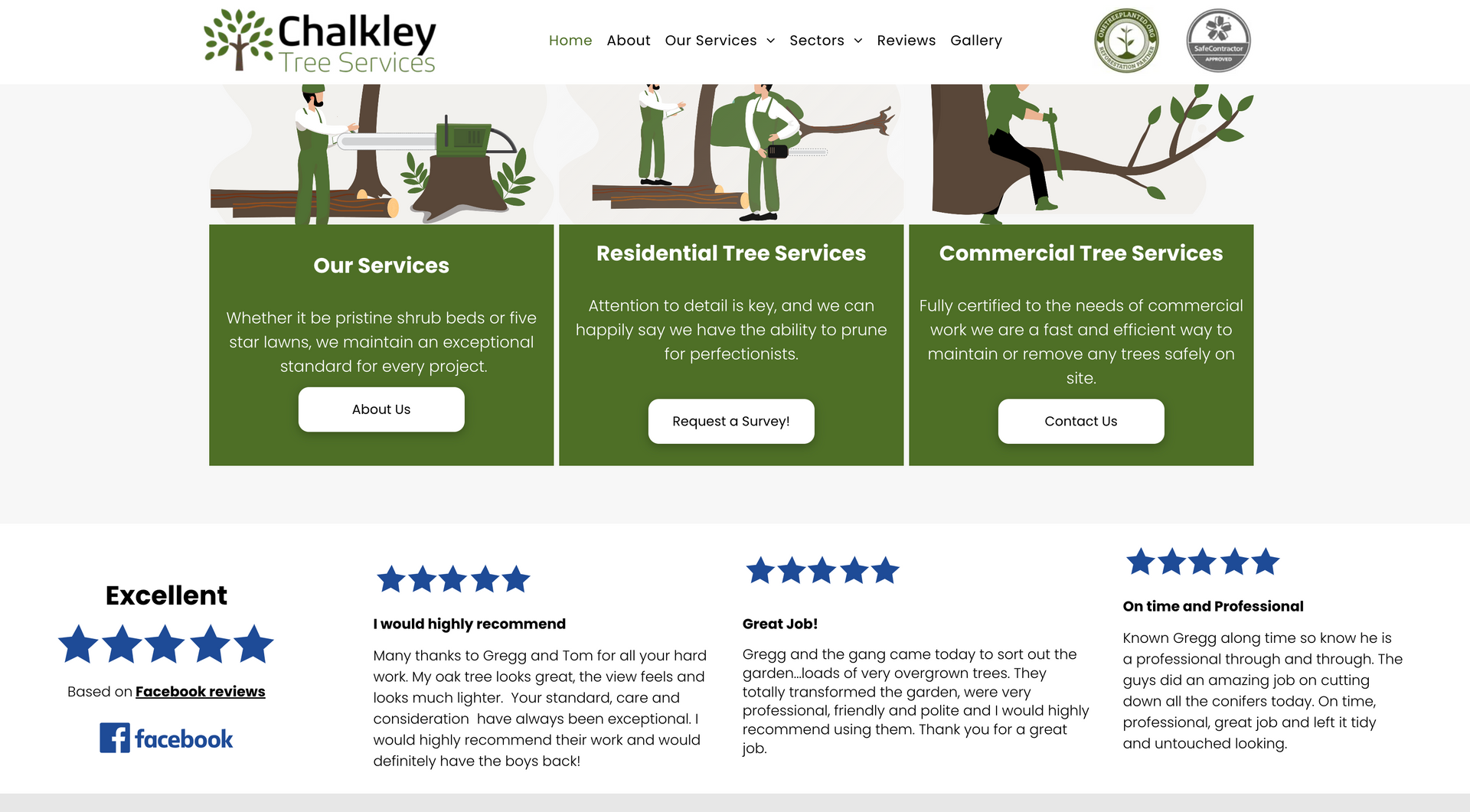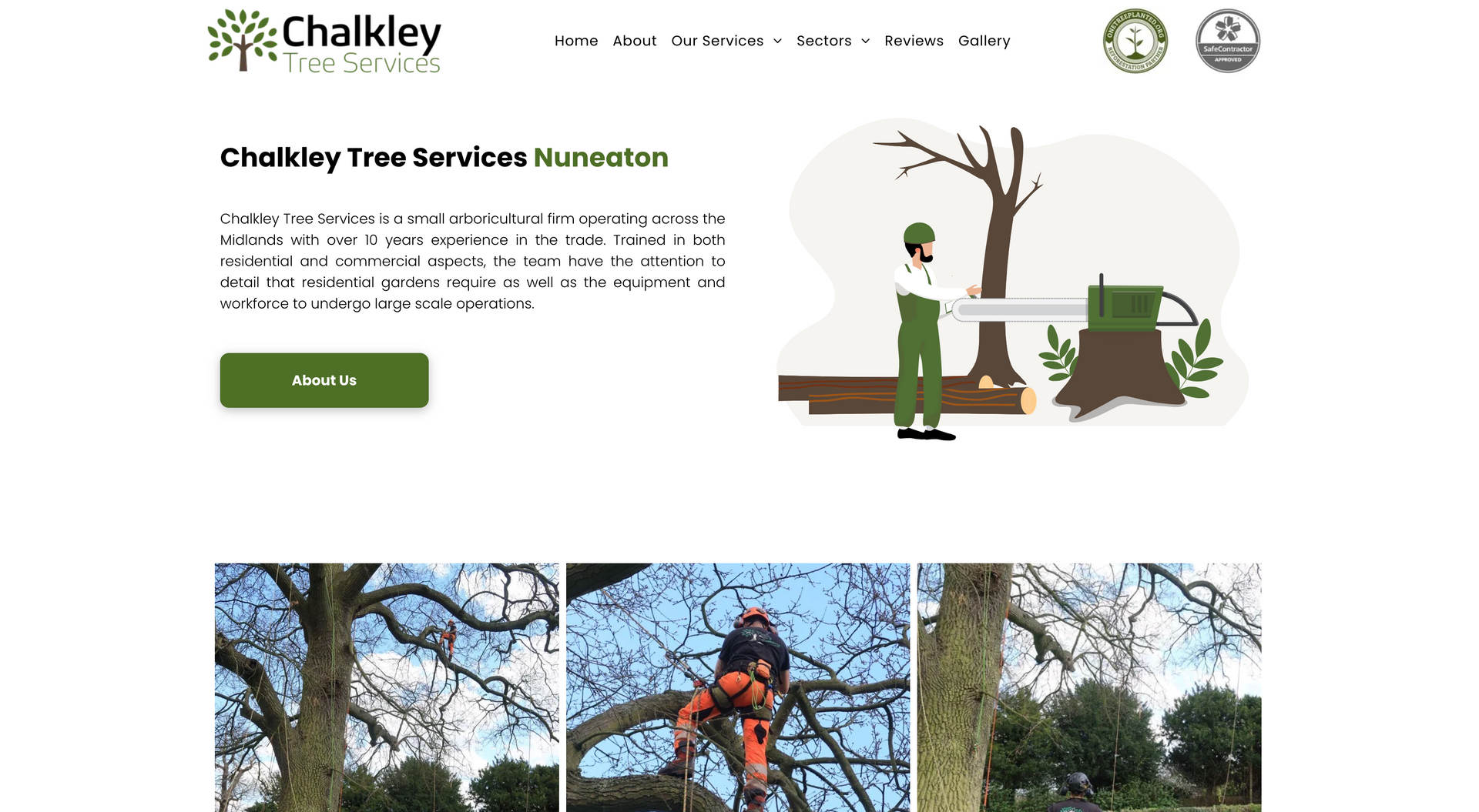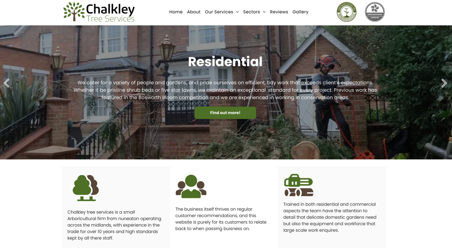 Chalkley tree services is a small arboricultural firm operating within the east midlands, servicing both residential gardens and large scale operations. As mentioned on the homepage, Chalkley tree services thrives on regular customers, the main purpose of the website is to showcase the work and explain services. It was important when building the site to keep a friendly, inviting atmosphere through conversational tone and graphics. Including customer reviews heavily based on the staff aids in showcasing the high quality customer service.