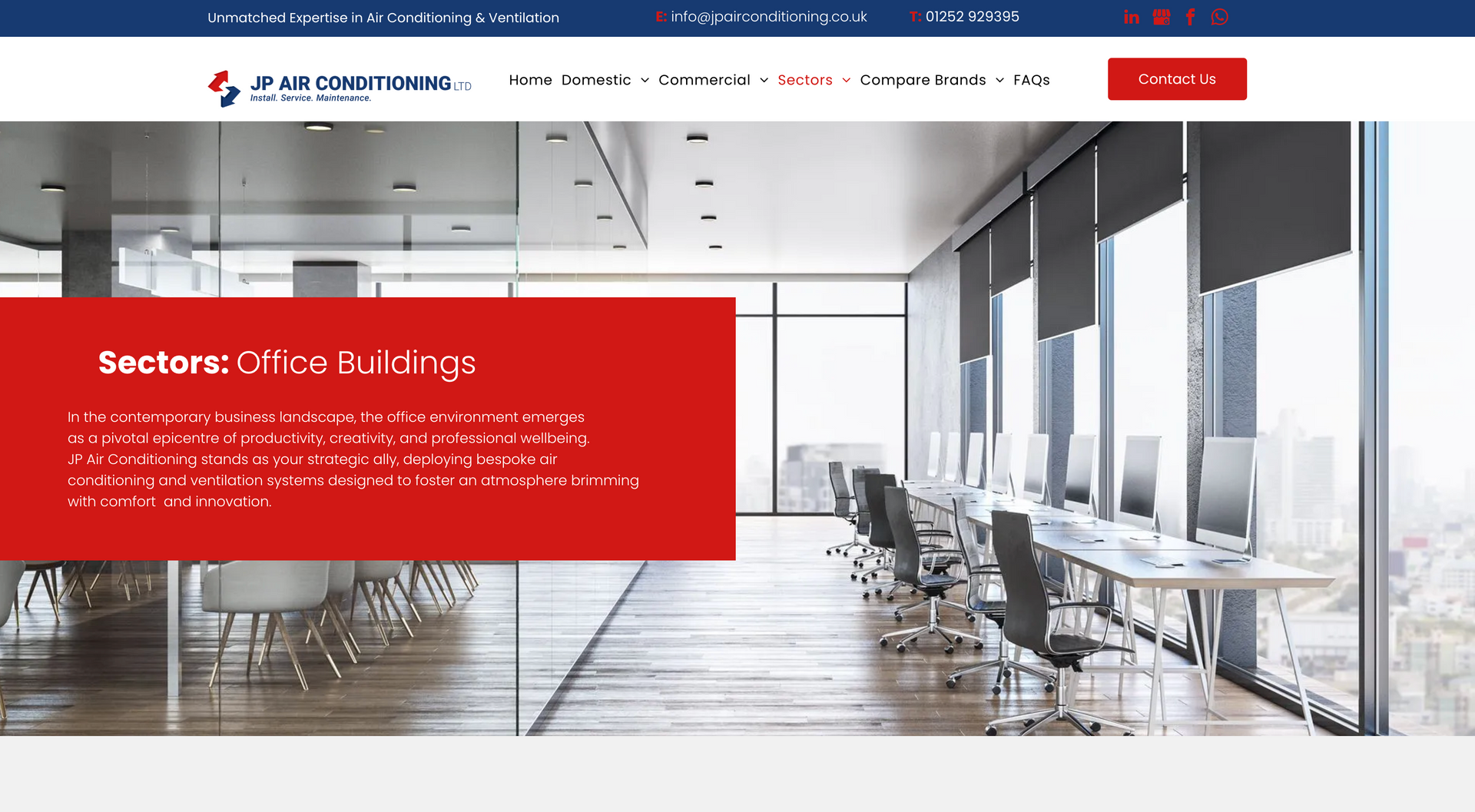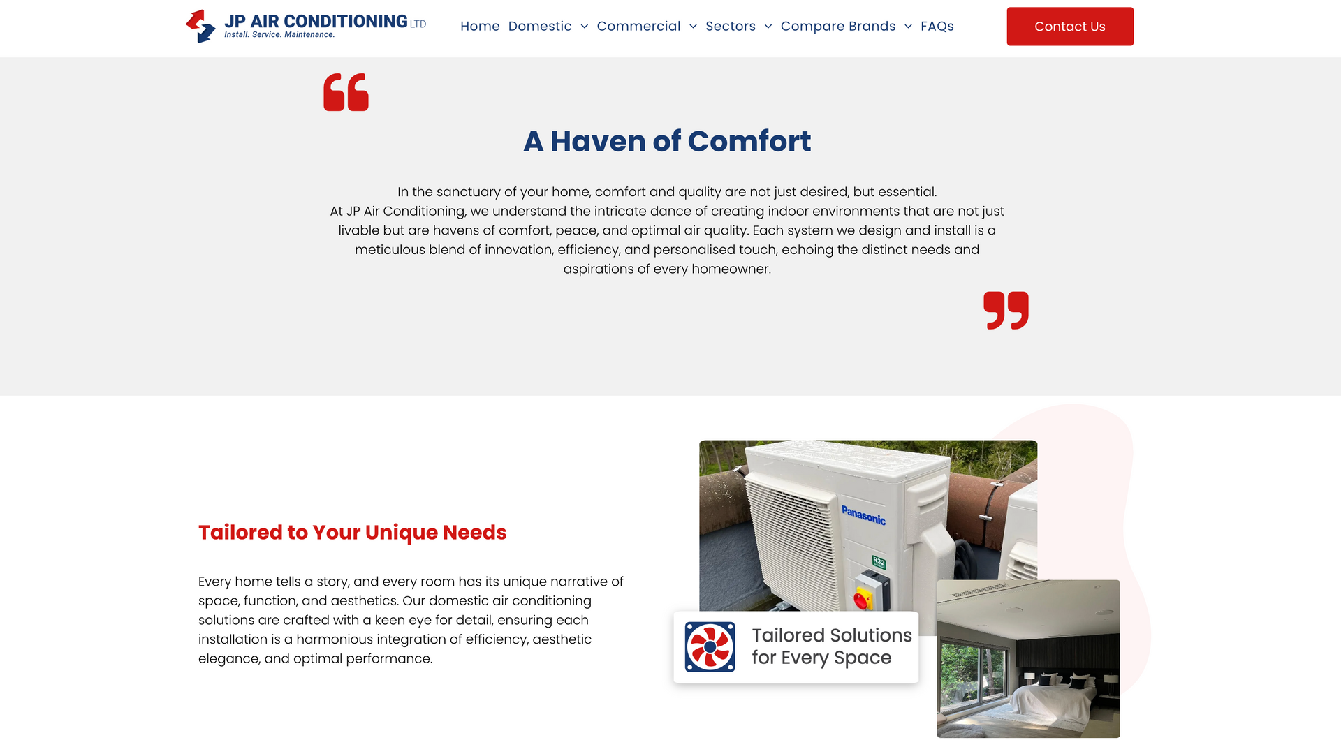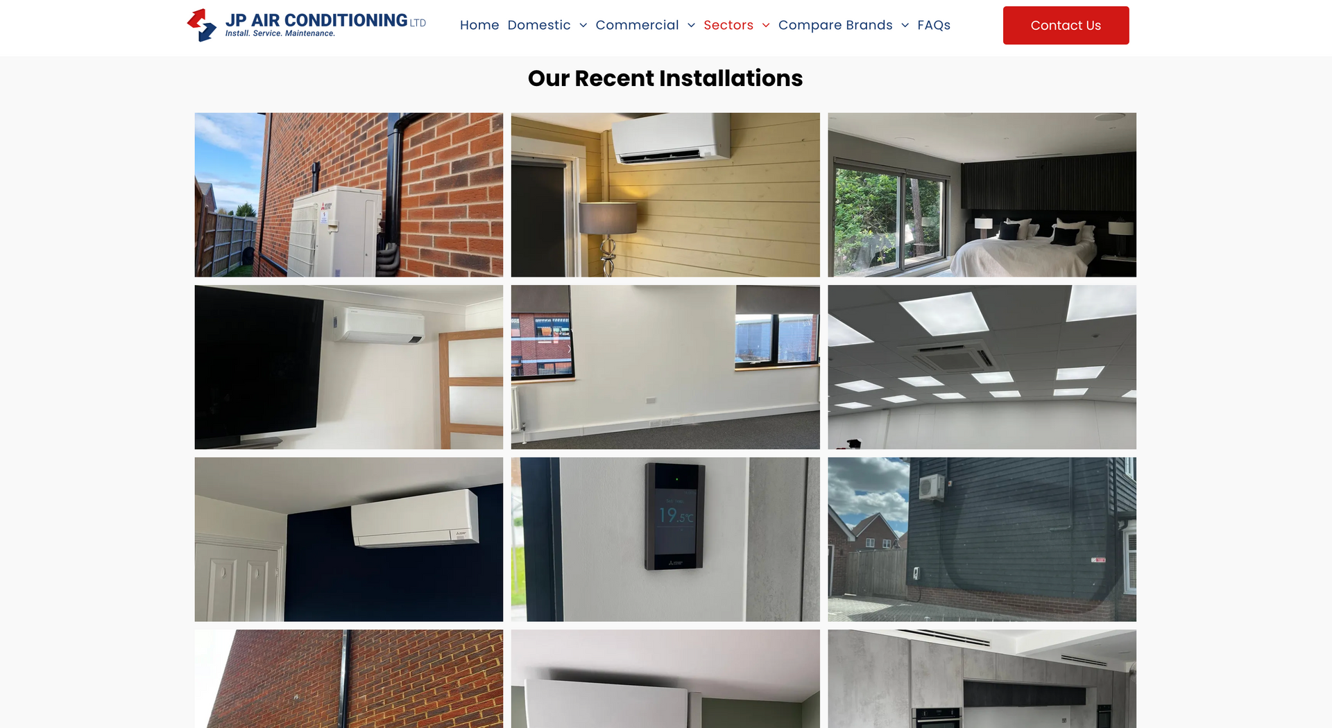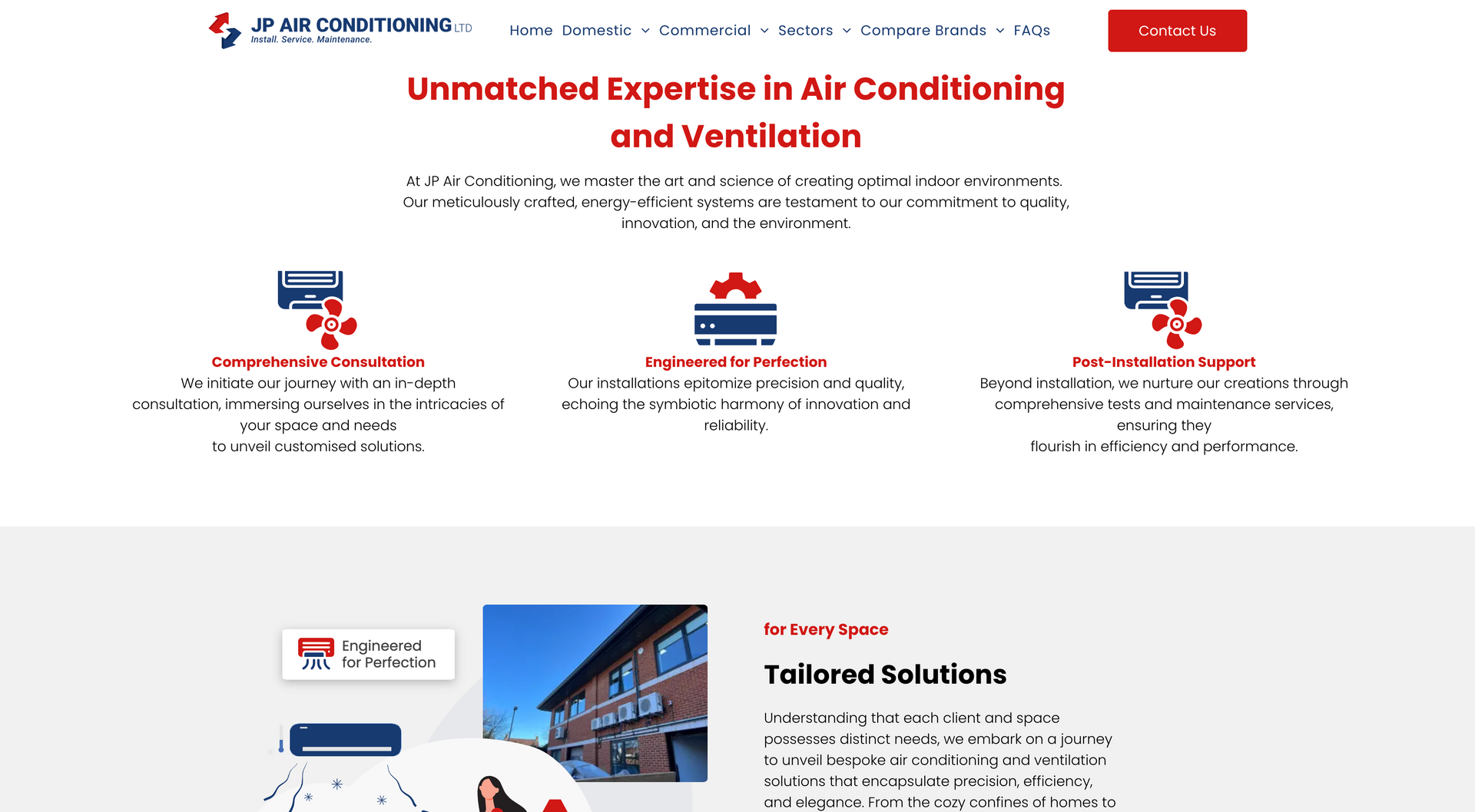 JP Air conditioning offers air conditioning and ventilation services across all sectors from homes to museums. As displayed in the website, JP Air conditioning offers a comprehensive consultation prior to installation as well as post-installation support. A portfolio of services on the website shows the incorporation of Air Con units into the design of the room