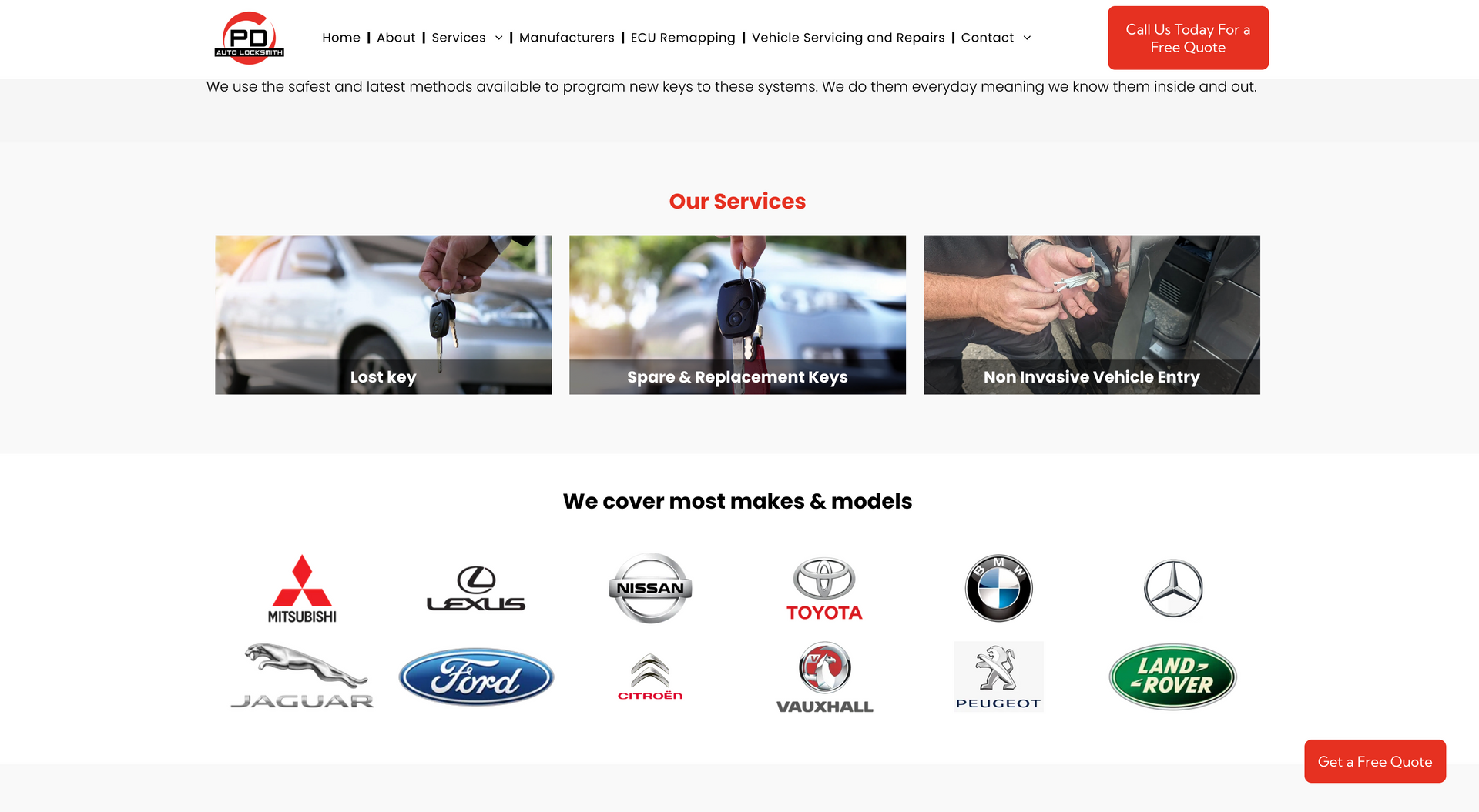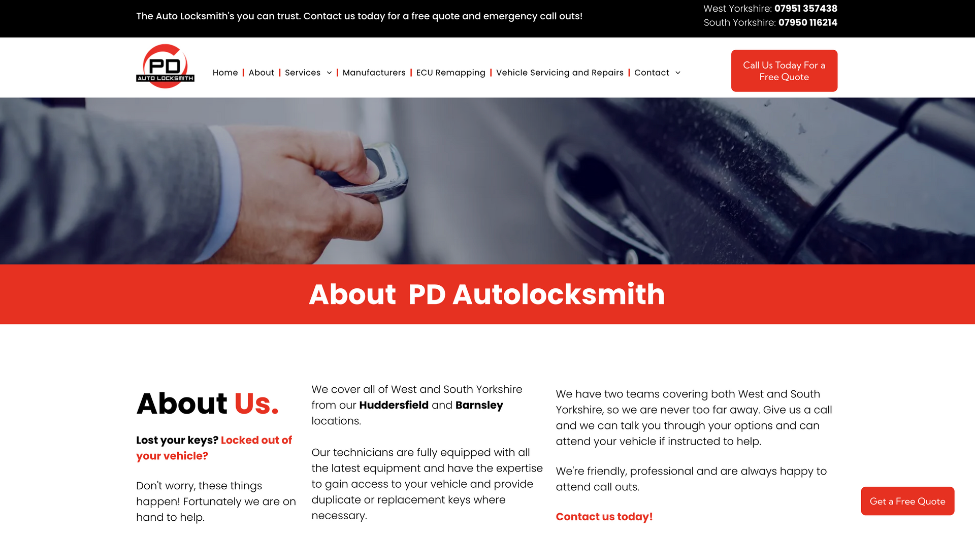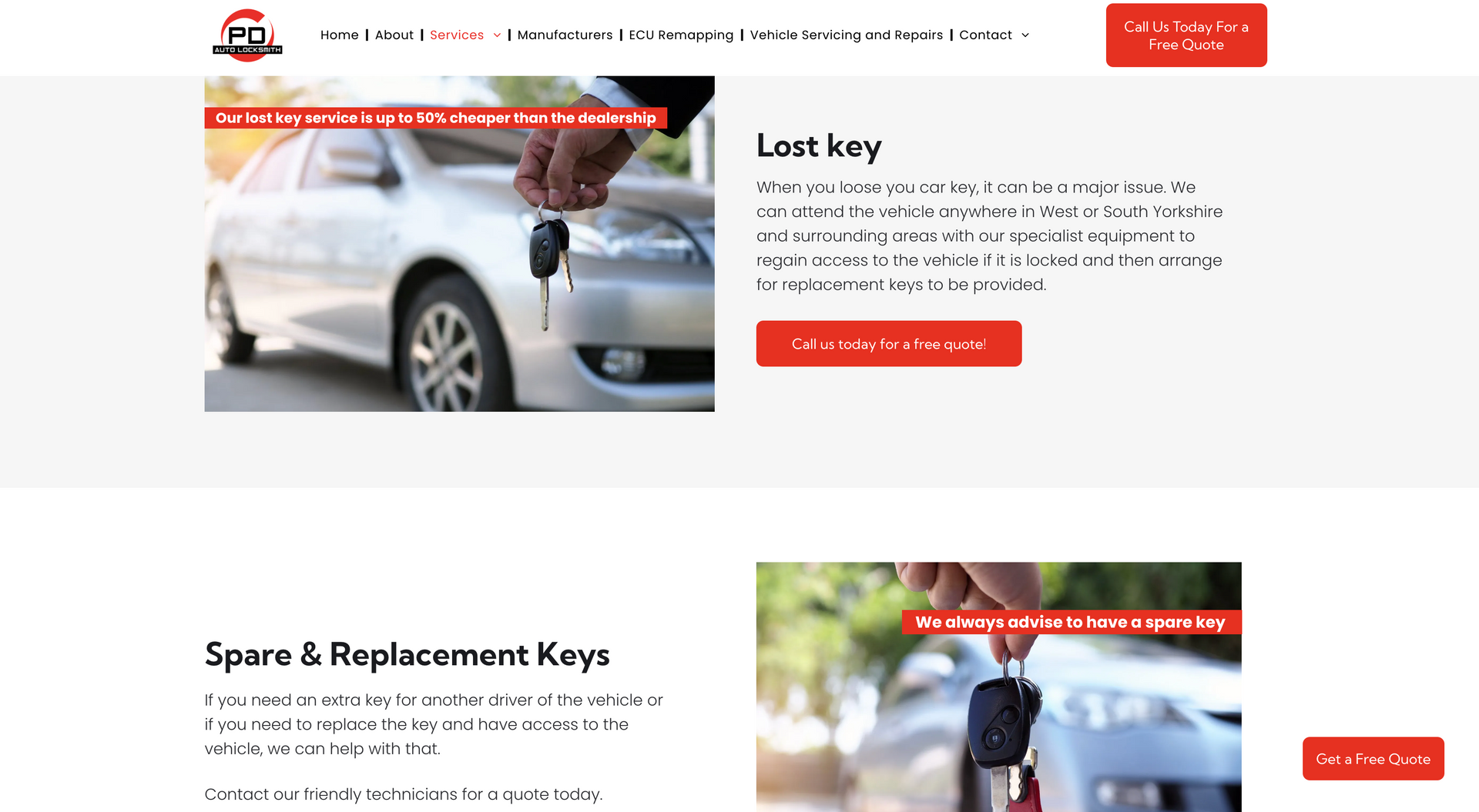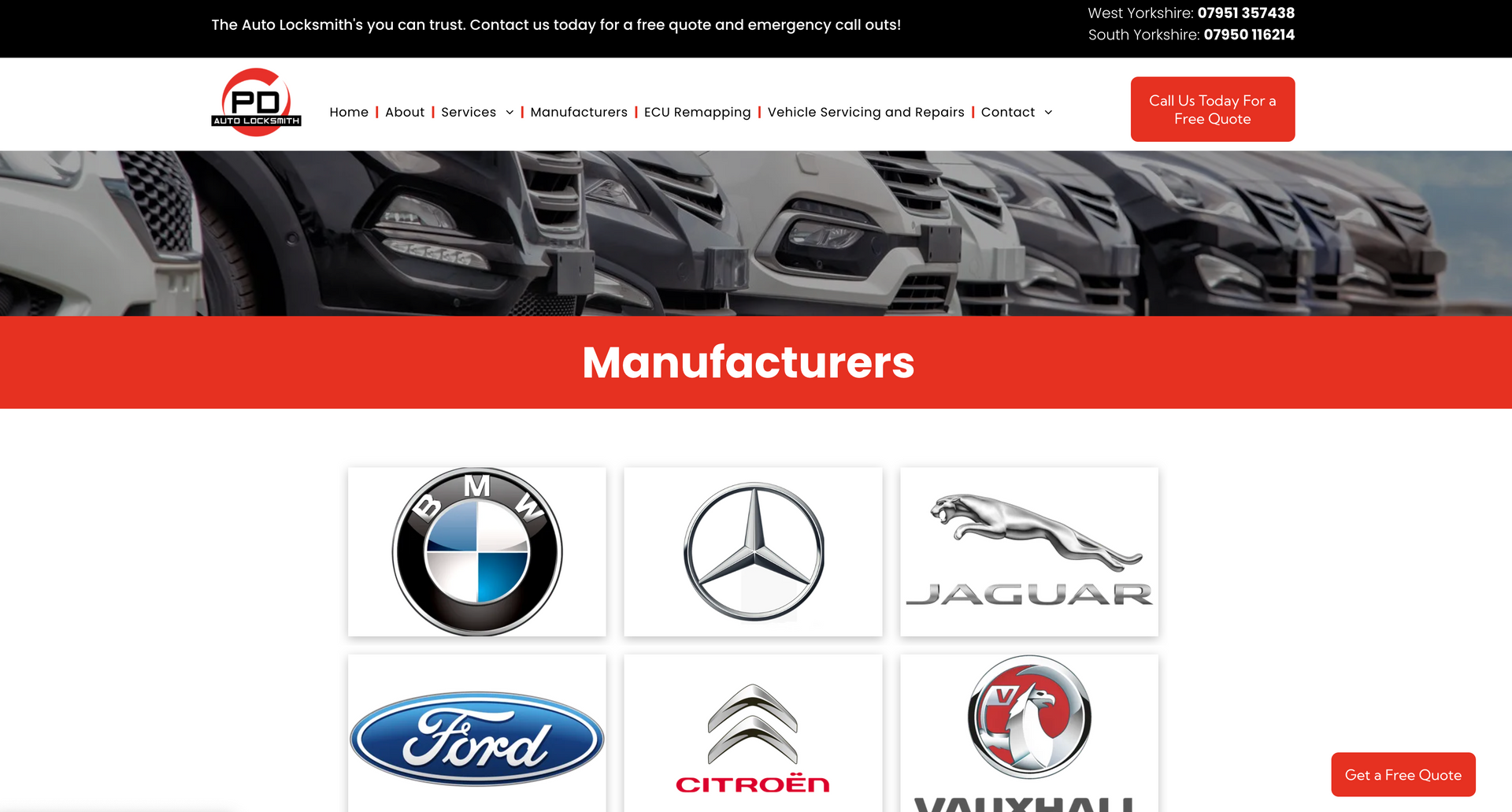 PD Auto Locksmiths cover West and Southwest Yorkshire for car unlocking issues. Using the latest technology and equipment, PD Auto Locksmiths have you covered from creating replacement keys on site or repairing ignitions and everything in between. As the nature of the company requires, contact details, especially telephone numbers, had to be made completely accessible and apparent. To highlight this, mobile phone icons were used on ‘call now’ widgets on the home page and contact details were available on every navigation page. It was also important to showcase the vehicle types covered by the company - to eliminate call times of customers phoning to check their vehicle was covered, we included a list with the logo’s, making it easily visible when opening the website.