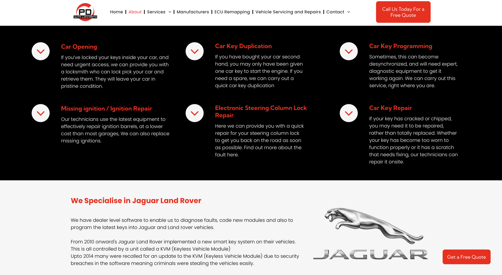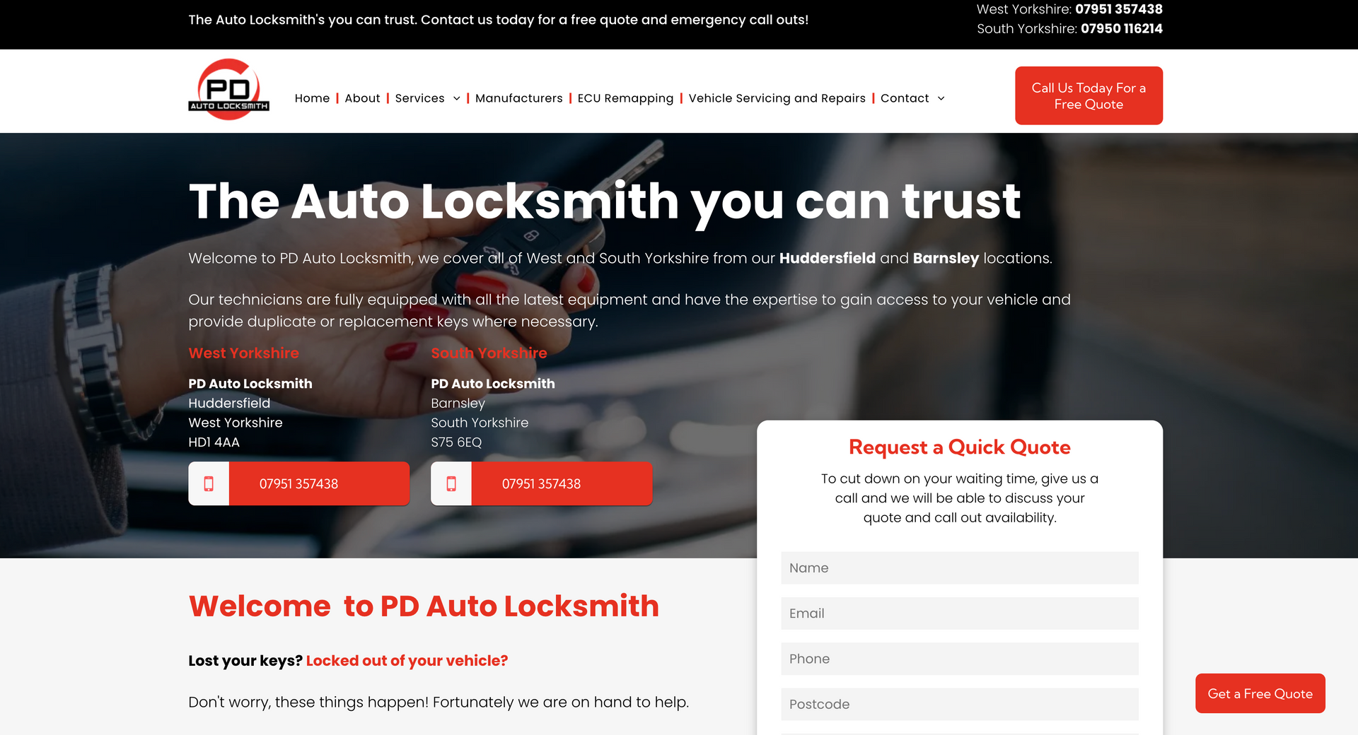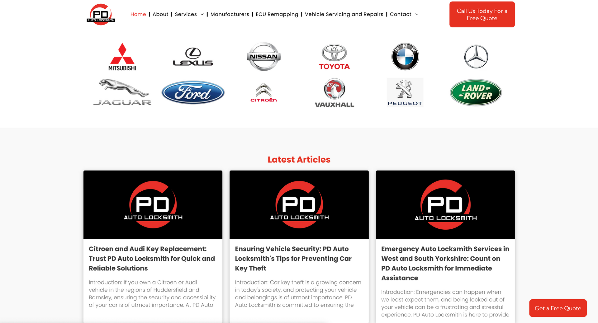 PD Auto Locksmiths cover West and Southwest Yorkshire for car unlocking issues. Using the latest technology and equipment, PD Auto Locksmiths have you covered from creating replacement keys on site or repairing ignitions and everything in between. As the nature of the company requires, contact details, especially telephone numbers, had to be made completely accessible and apparent. To highlight this, mobile phone icons were used on ‘call now’ widgets on the home page and contact details were available on every navigation page. It was also important to showcase the vehicle types covered by the company - to eliminate call times of customers phoning to check their vehicle was covered, we included a list with the logo’s, making it easily visible when opening the website.