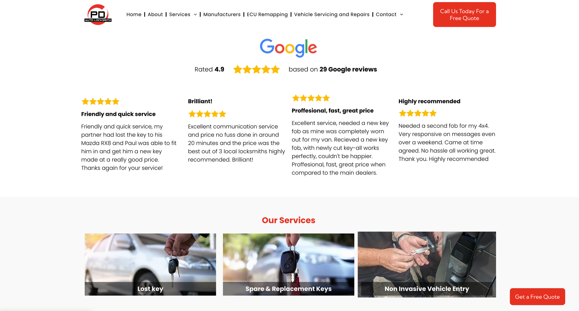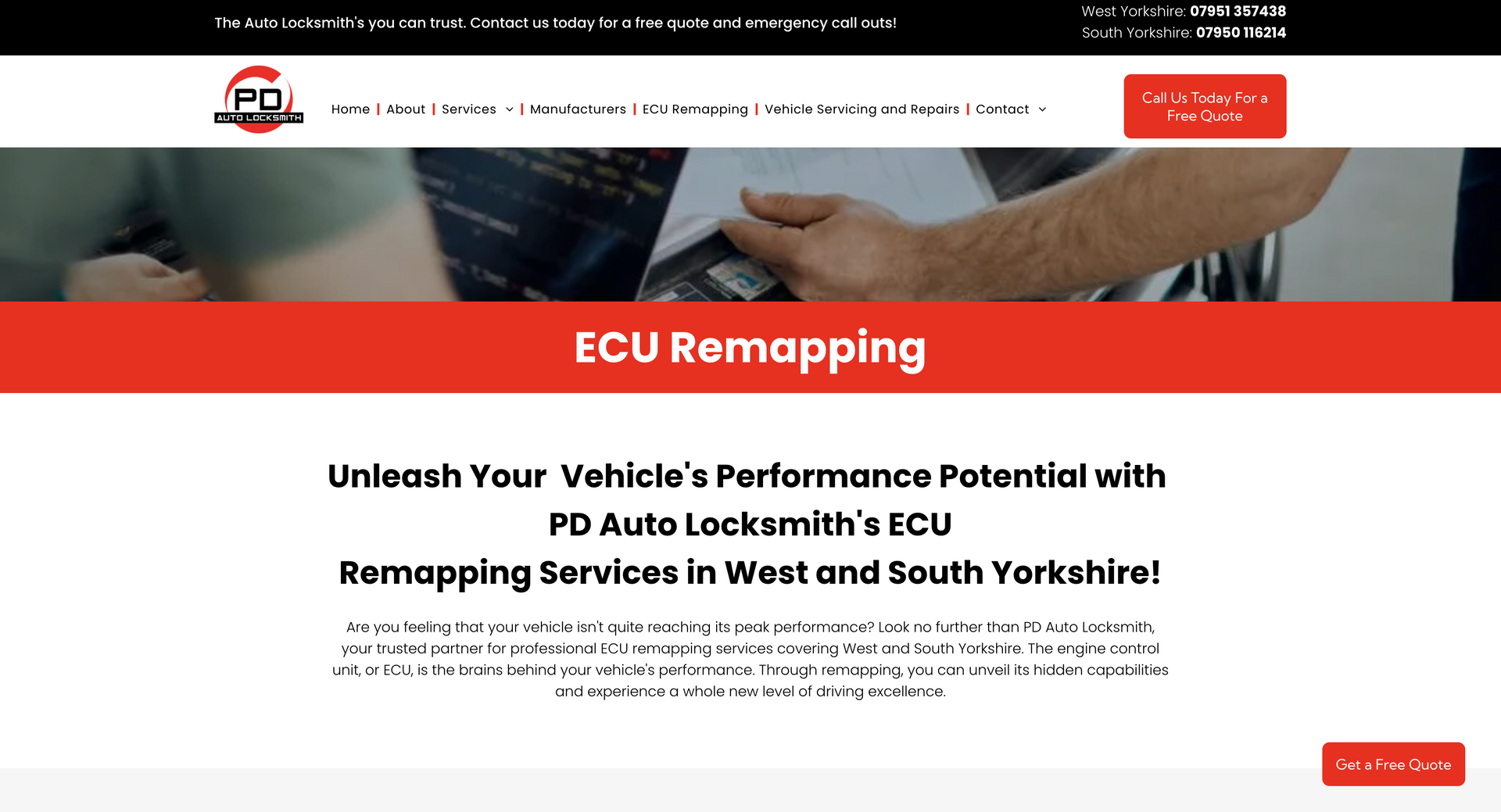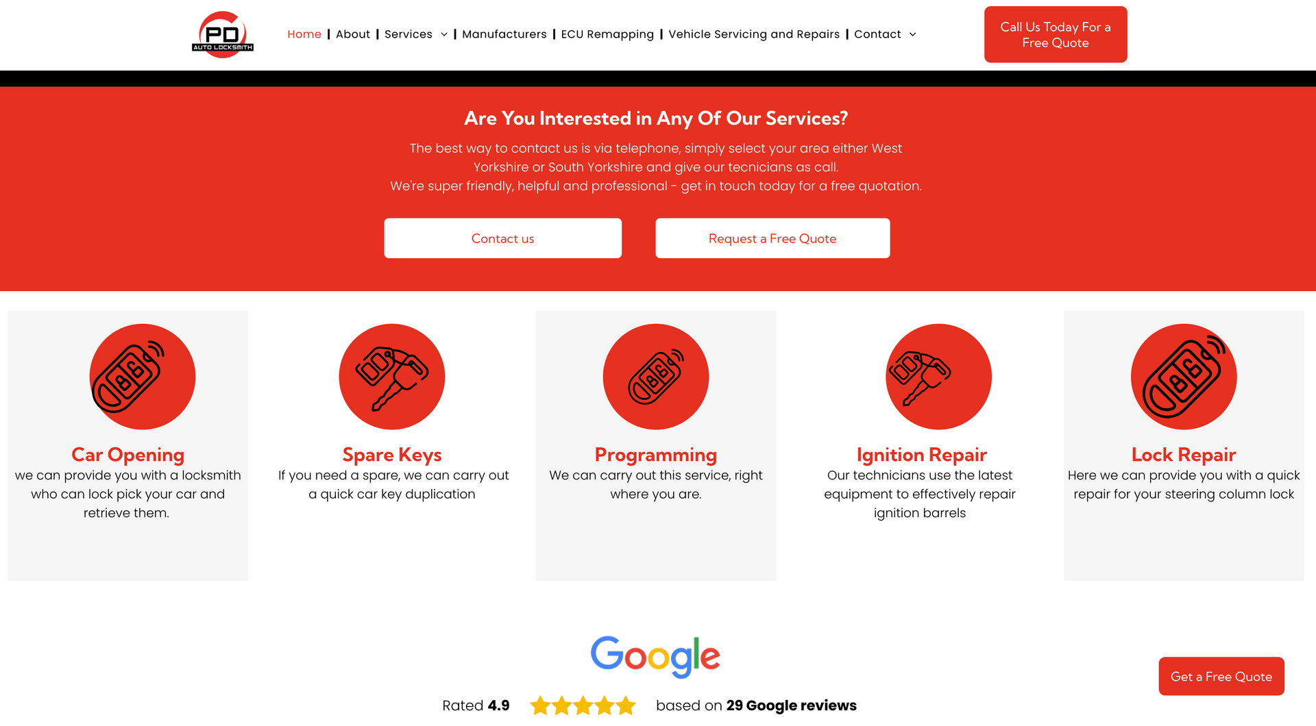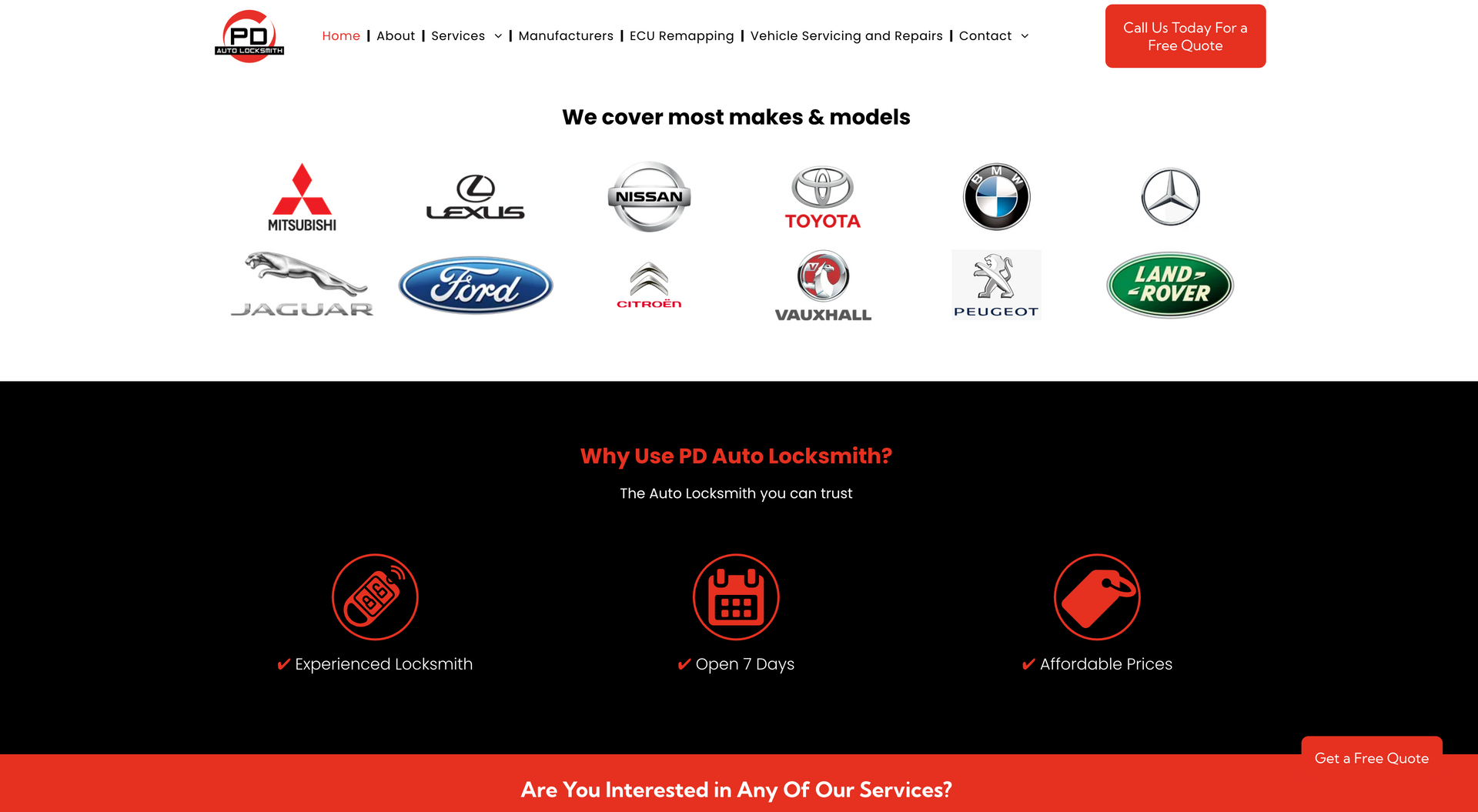 PD Auto Locksmiths cover West and Southwest Yorkshire for car unlocking issues. Using the latest technology and equipment, PD Auto Locksmiths have you covered from creating replacement keys on site or repairing ignitions and everything in between. As the nature of the company requires, contact details, especially telephone numbers, had to be made completely accessible and apparent. To highlight this, mobile phone icons were used on ‘call now’ widgets on the home page and contact details were available on every navigation page. It was also important to showcase the vehicle types covered by the company - to eliminate call times of customers phoning to check their vehicle was covered, we included a list with the logo’s, making it easily visible when opening the website.