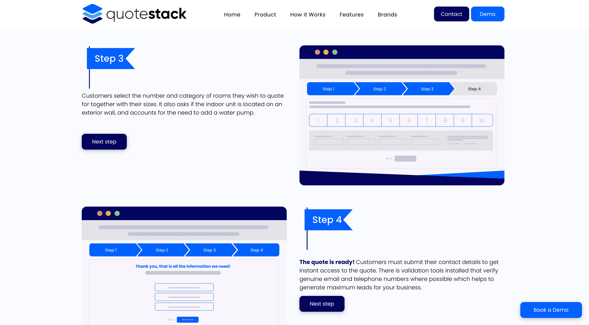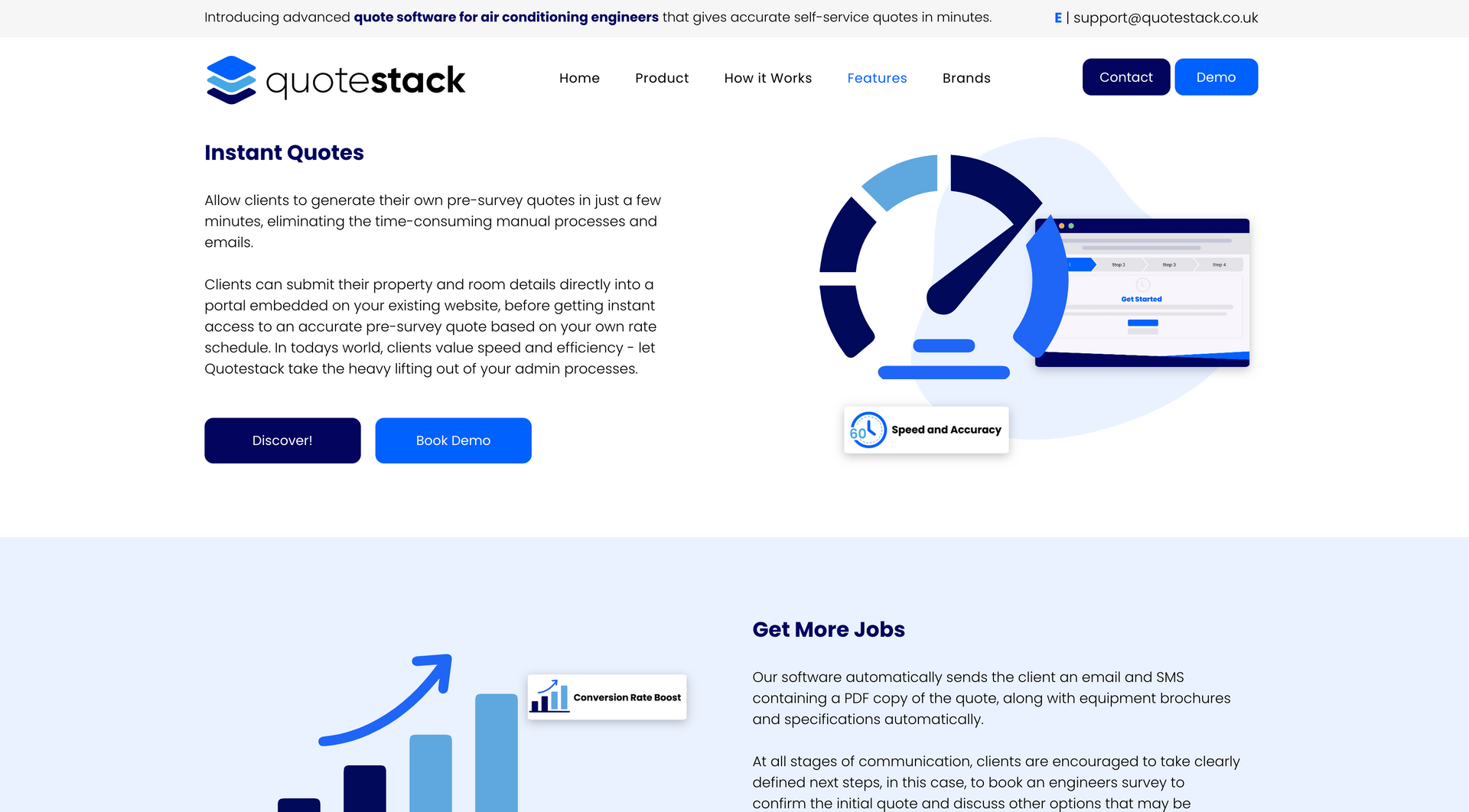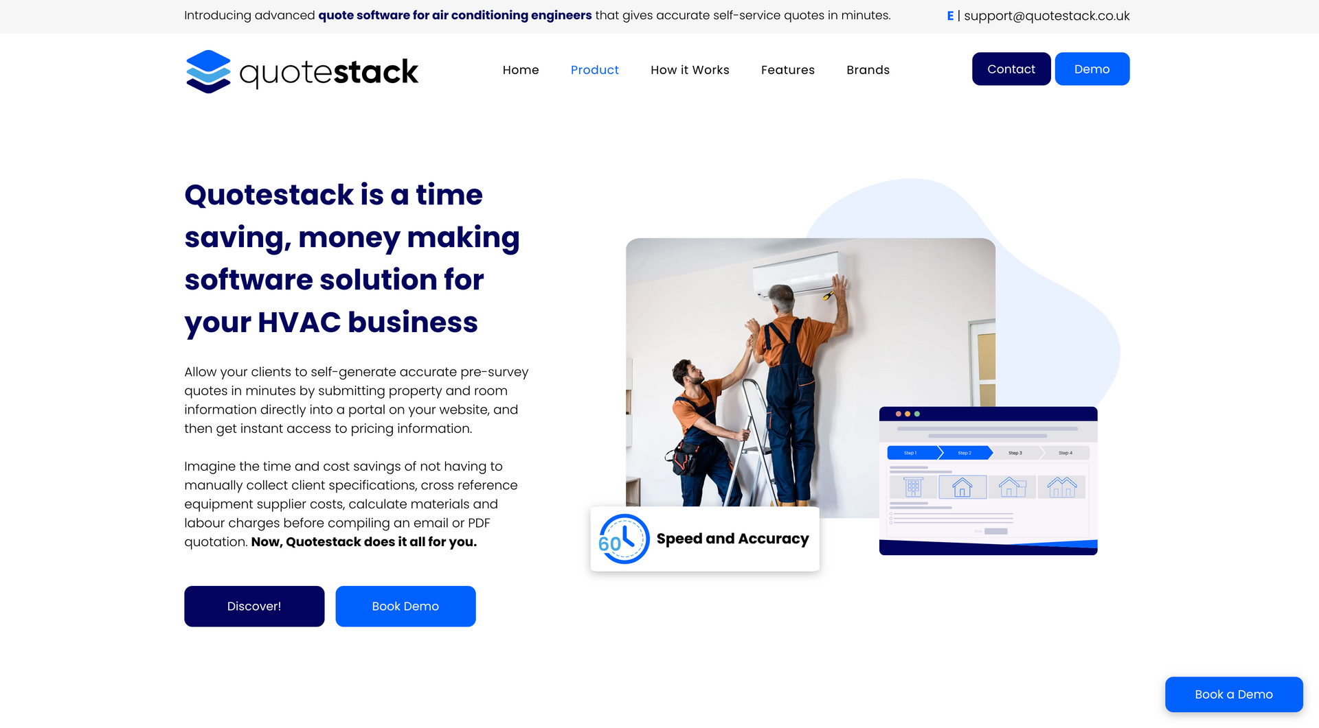‘Quote Stack helps air conditioning engineers make more money” - the Qoute stack calculator has been designed using AI to calculate the most efficient and cost effective solutions to air conditioning for a specific property and client. The product here is the calculator, which can be purchased by air conditioning firms and used on their website, allowing the customer to input information and calculating the best possible route and cost of installation, passing this information on to the company. Communicating these steps and the benefits to the client in a clear and concise way was essential for the brand. This was carried out with a step by step guide, uninterrupted by cluttered widgets and pop ups.