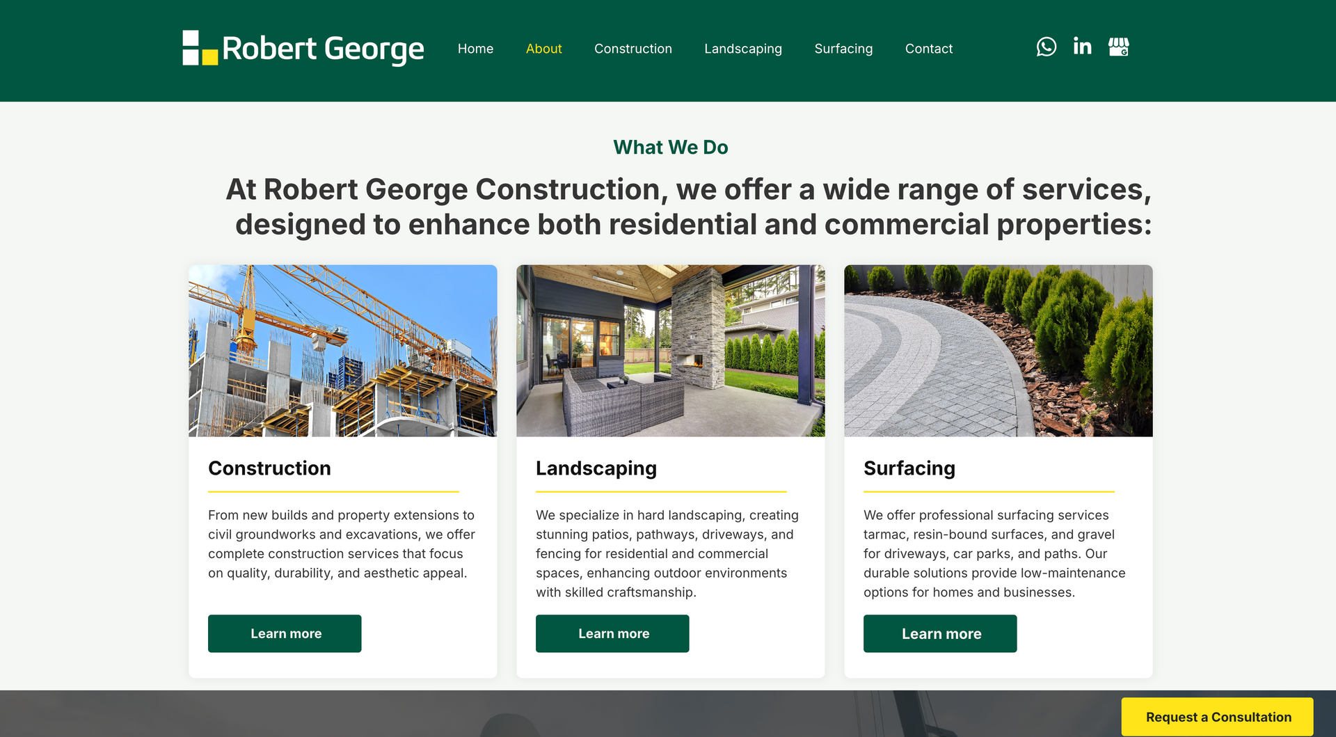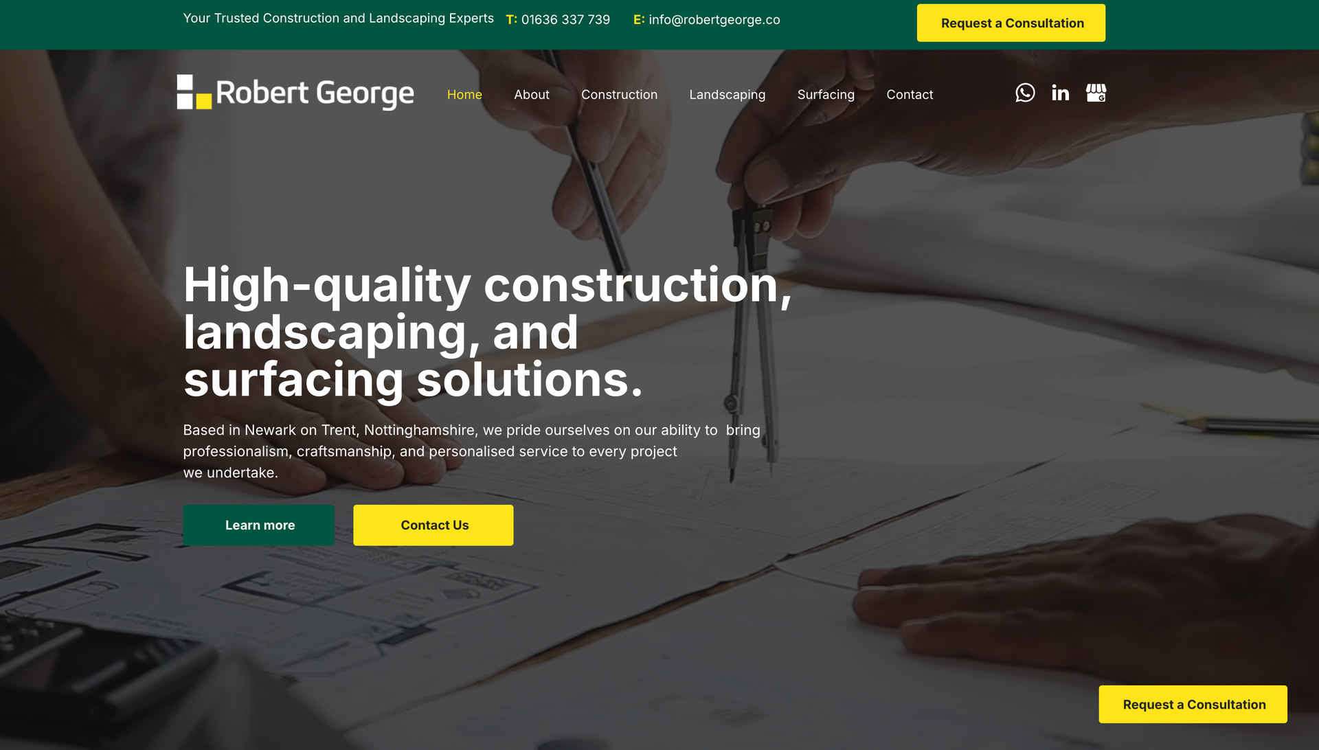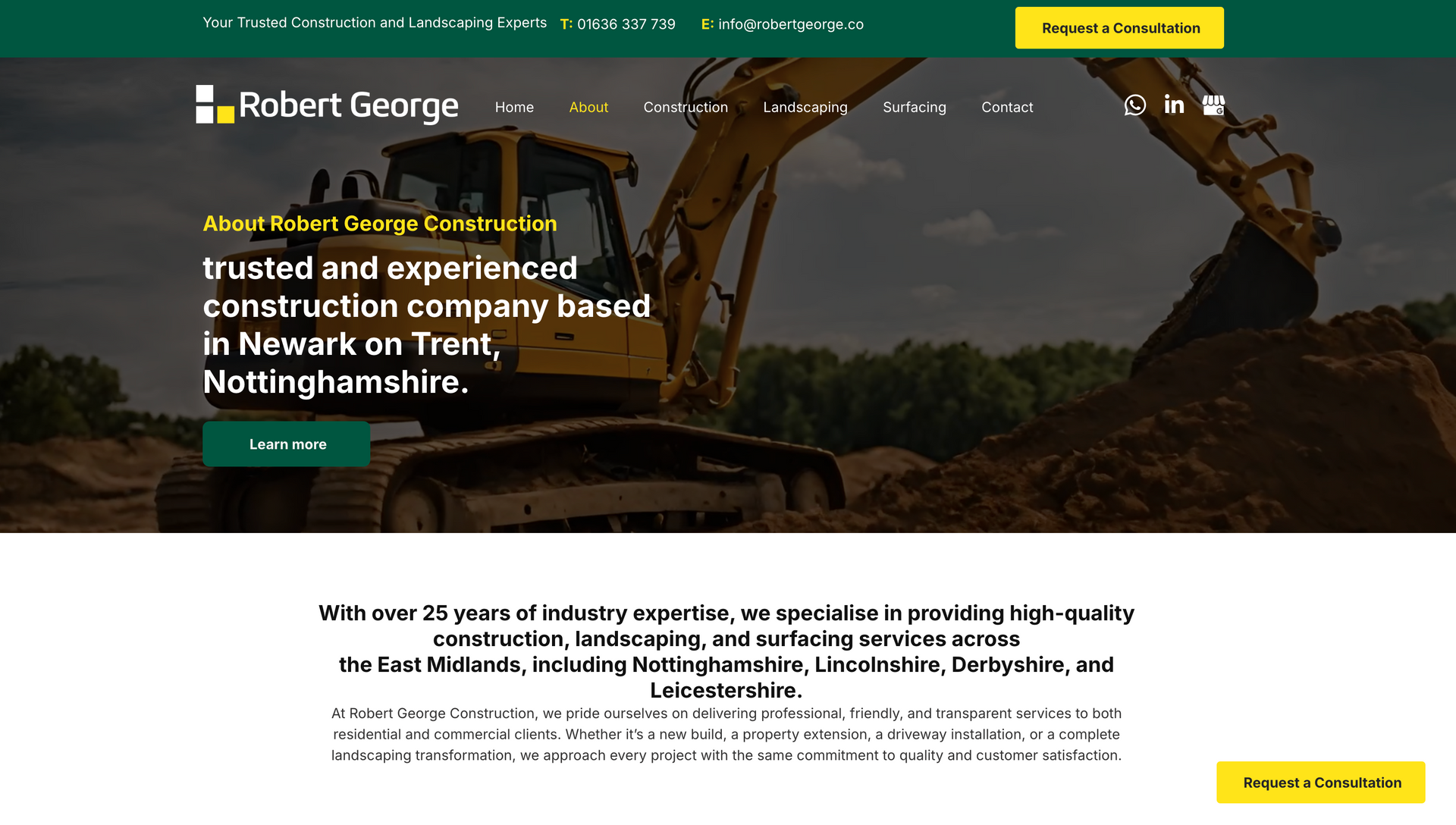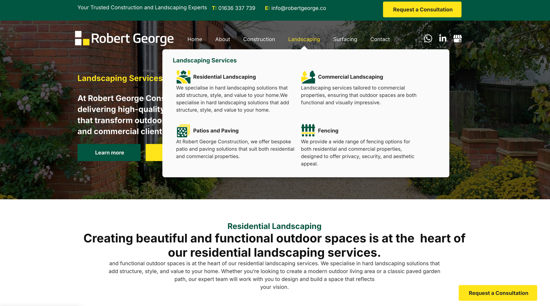 Robert George is a construction, surfacing and landscaping company. Specific to this company is that they are regionally focused, unlike many companies looking to expand nationwide Robert George is focused on understanding and meeting the needs of Nottinghamshire. The focus of this piece was to showcase services and create trust between the service supplier and customer using a transparent pricing system.