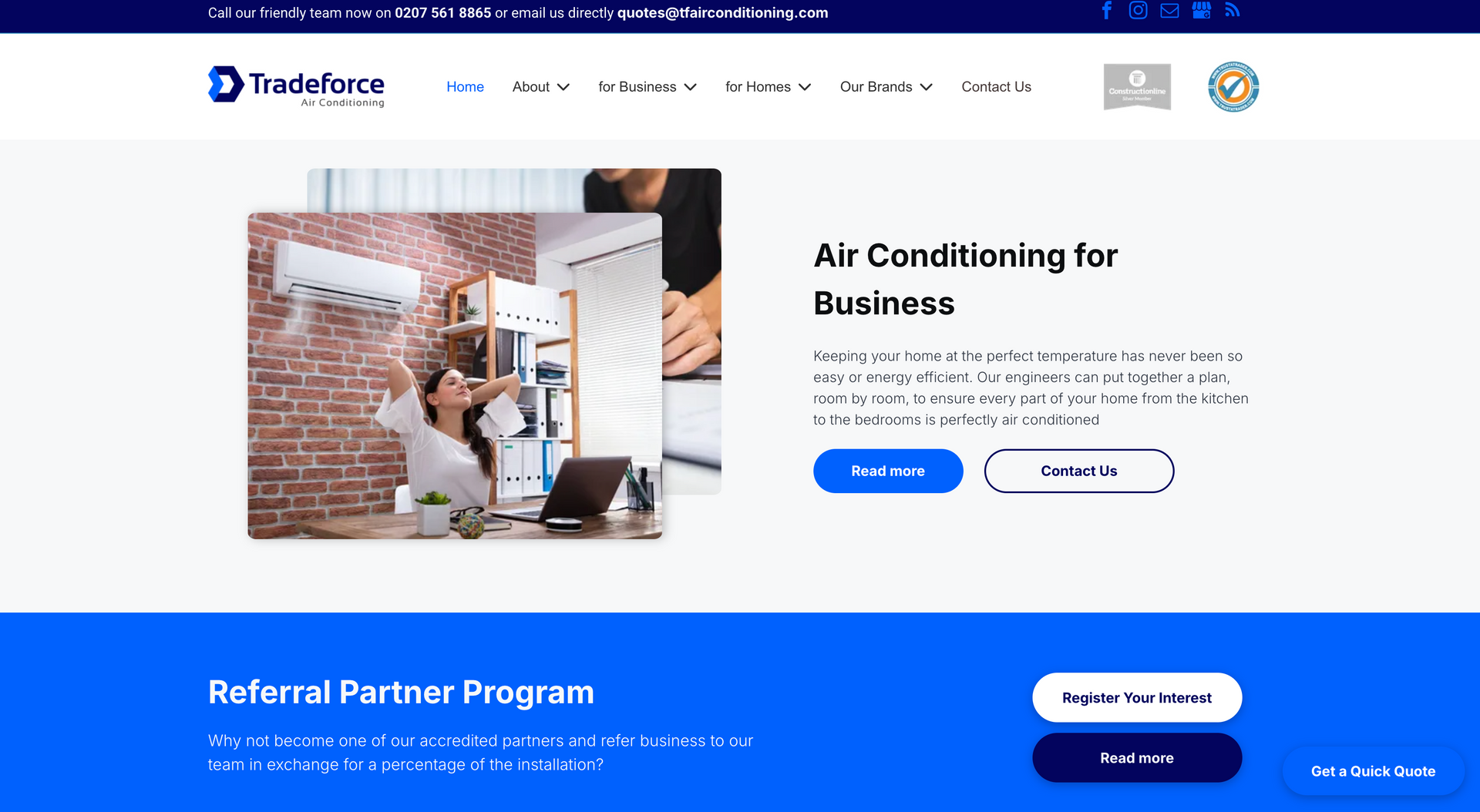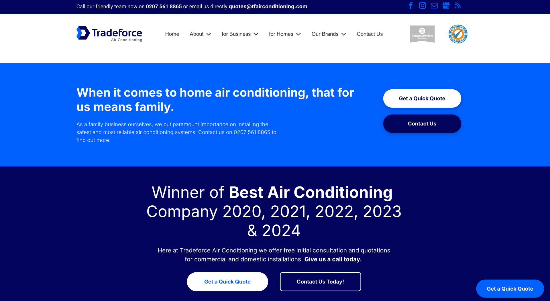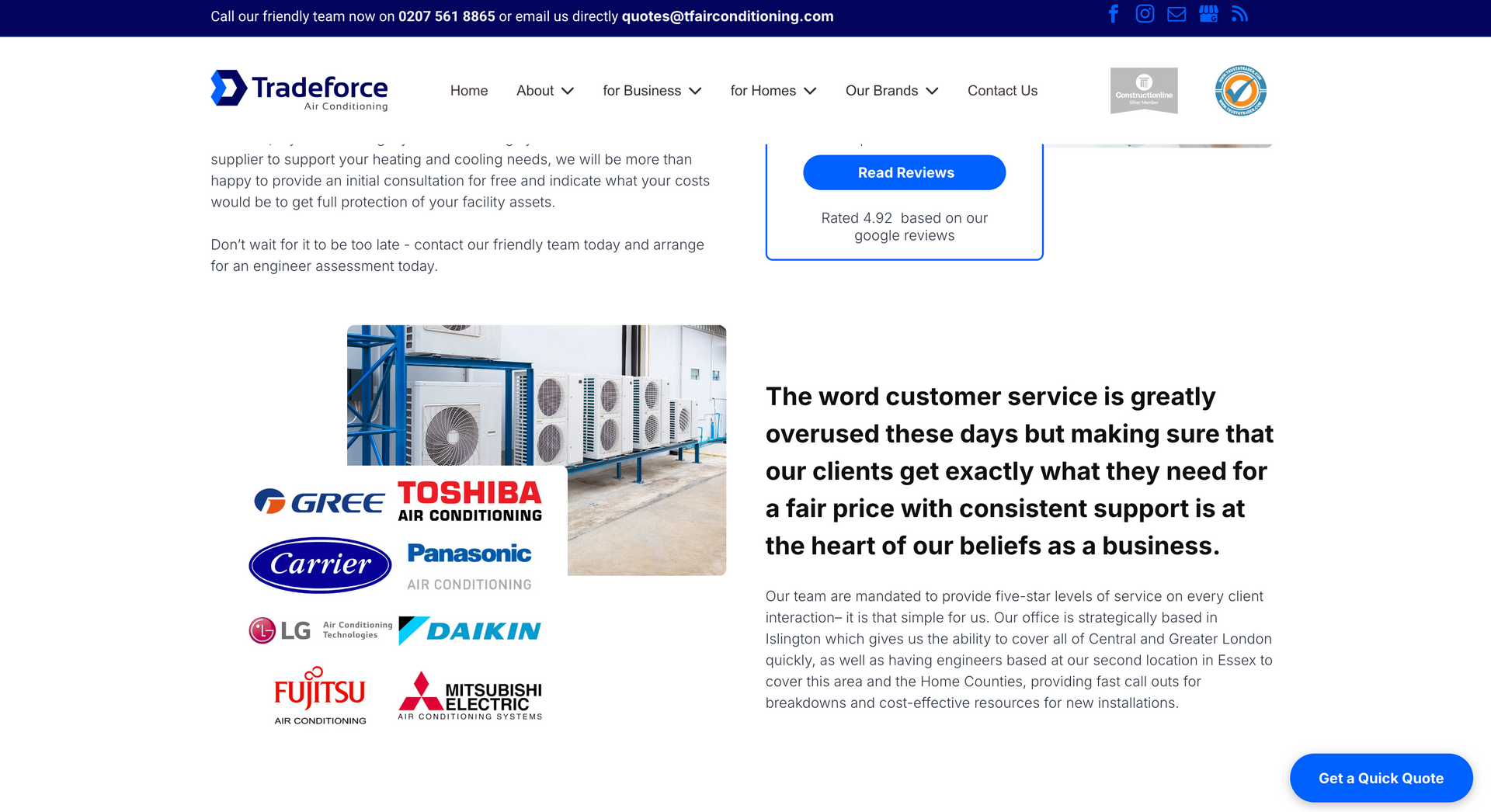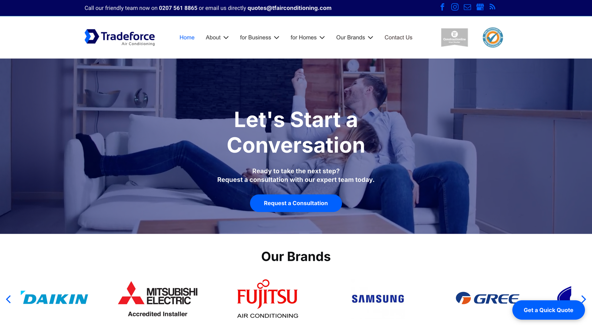 TF Air Conditioning provides air con fitting and maintenance across the UK across domestic and commercial sectors. For the client, a selling point is the variety of household name companies they have worked with, from Mitsubishi to Samsung. It was important to display this on the site alongside the certifications to show the reputability of the company
