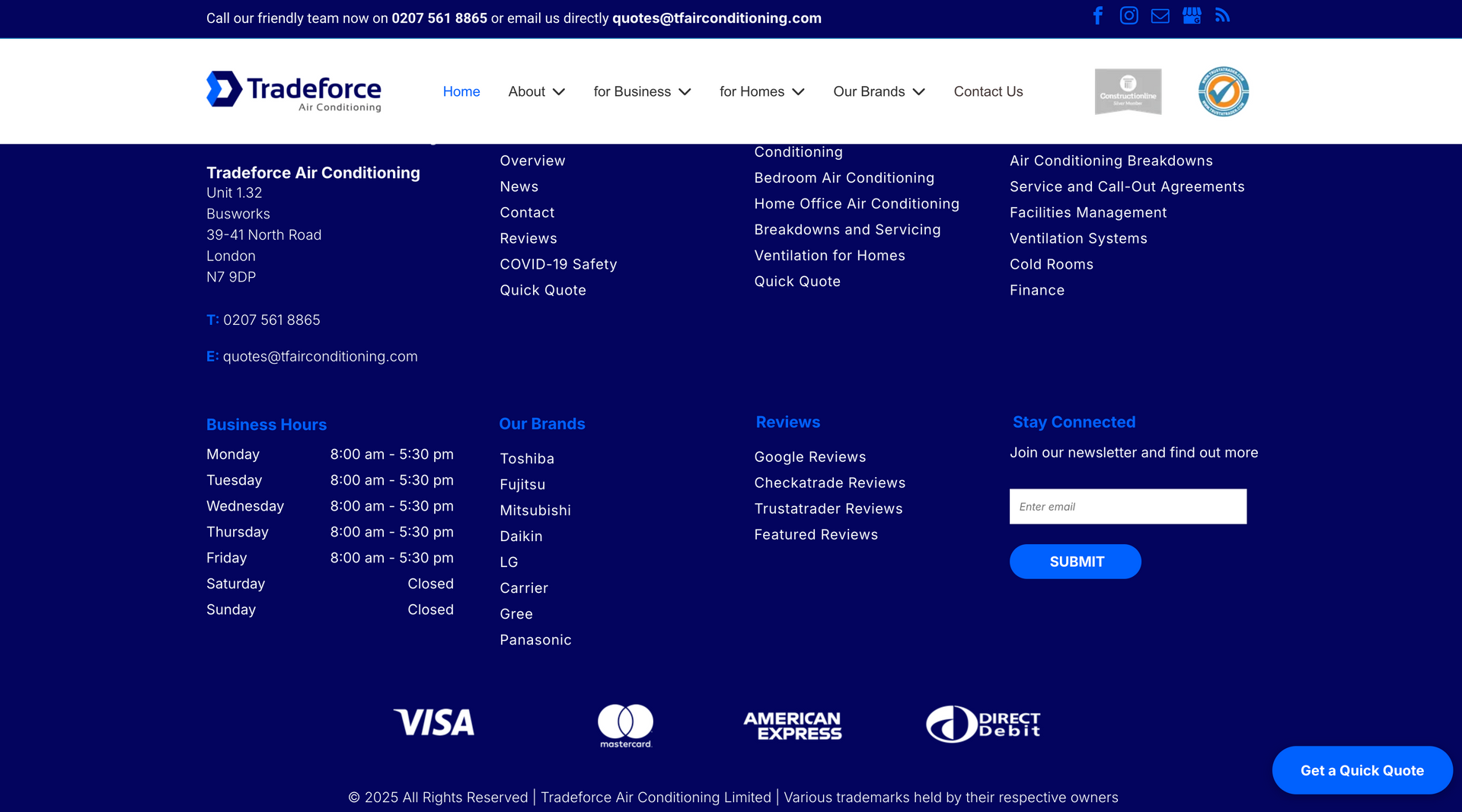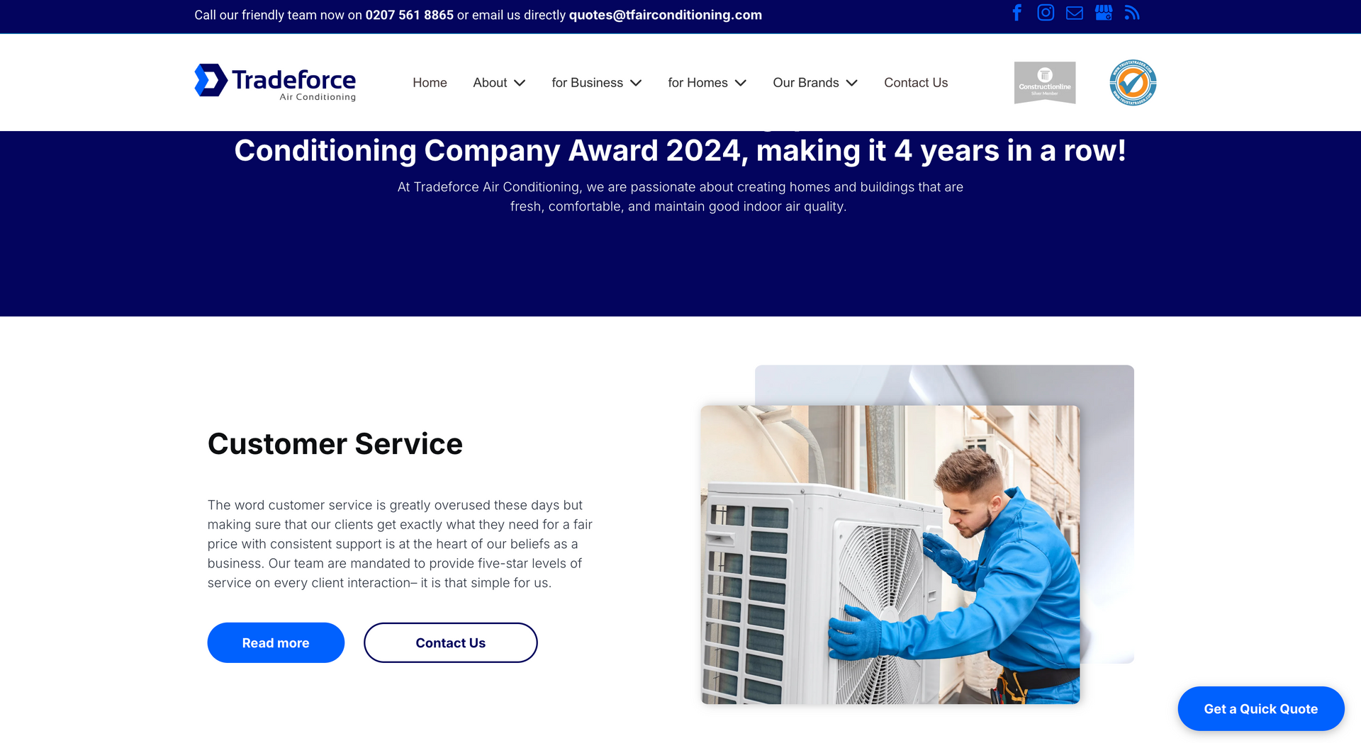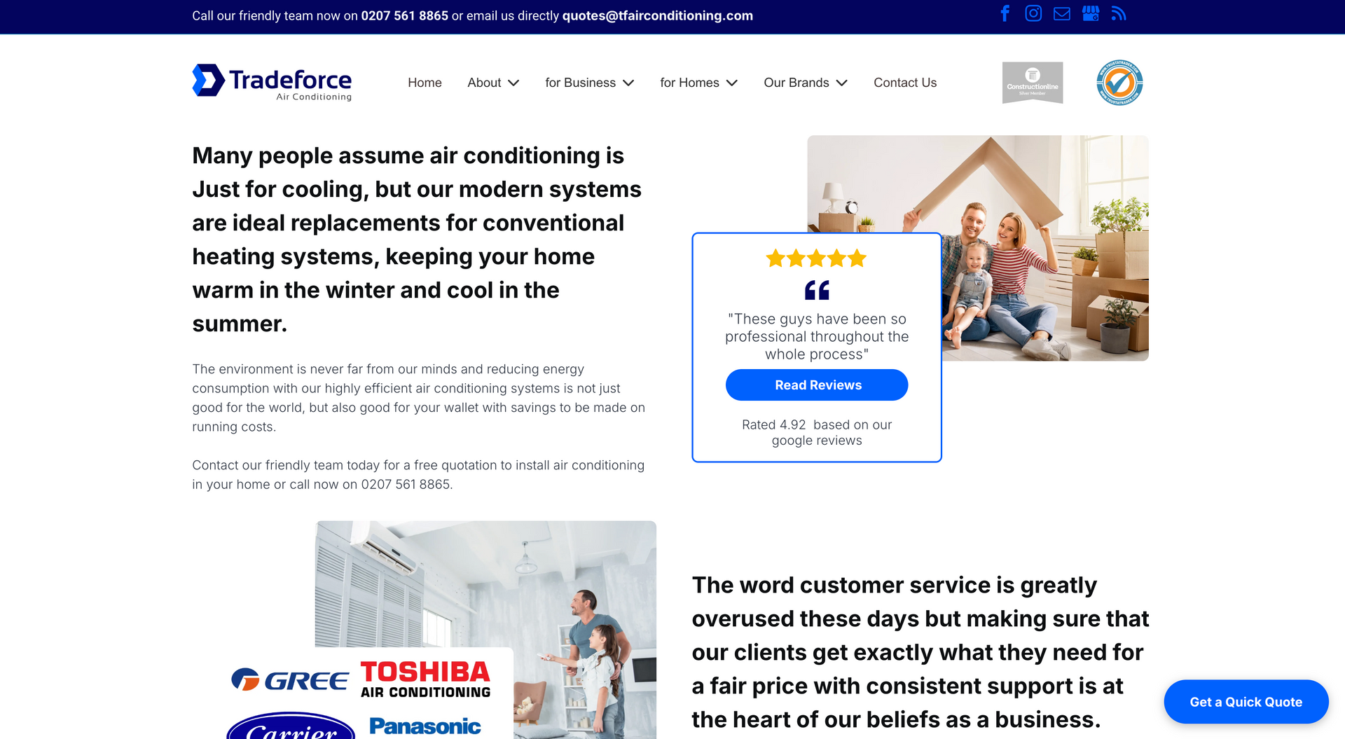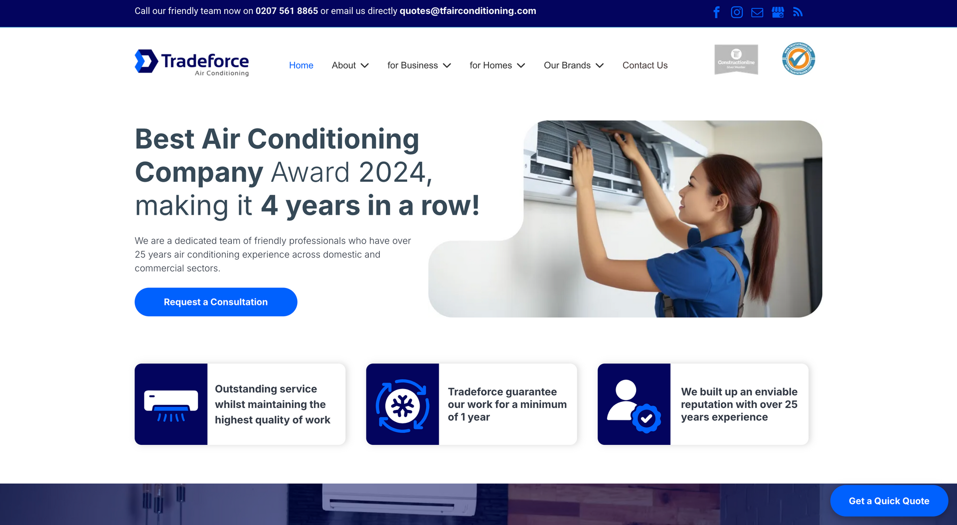 TF Air Conditioning provides air con fitting and maintenance across the UK across domestic and commercial sectors. For the client, a selling point is the variety of household name companies they have worked with, from Mitsubishi to Samsung. It was important to display this on the site alongside the certifications to show the reputability of the company